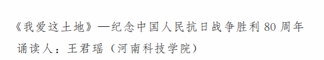 河南省教科文卫体工会发文表彰在“2025年‘悦读新思想’职工经典诵读活动”中获奖的作品。我校选送的5个作品,获得了4个奖项。其中马克思主义学院教师王君瑶的作品“《我爱这土地》—纪念中国人民抗日战争胜利80周年”获得短视频组三等奖,其他3个作品分获优秀奖。