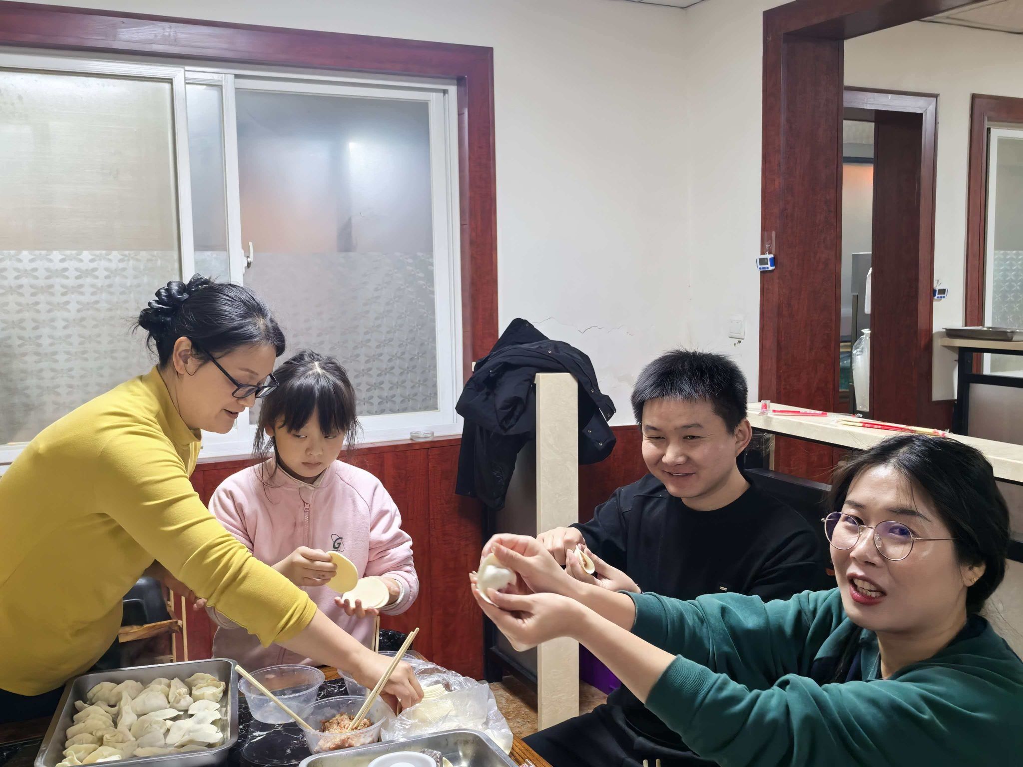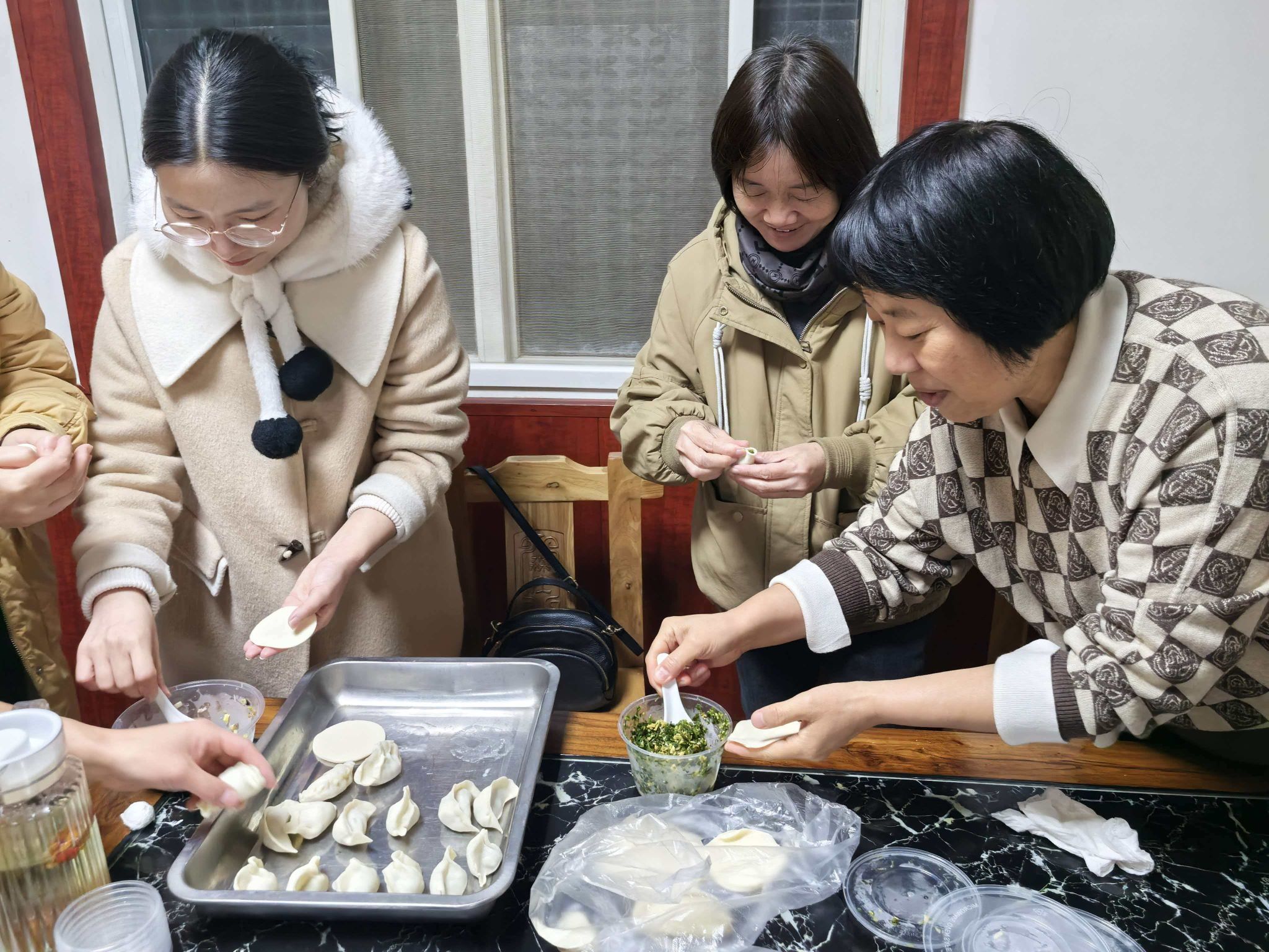 活动现场暖意融融、热闹非凡。学院早早备齐了面粉、馅料、擀面杖等食材和工具。老师们纷纷撸起袖子,化身“包饺子能手”,分工协作、各显身手。有的老师手法娴熟,擀皮、填馅、捏褶一气呵成,一个个圆润饱满的饺子很快成型;有的老师则是“新手”,在身边同事的指导下认真学习,虽然包出的饺子形态各异,却也别具趣味。大家围在一起,一边包饺子,一边话家常,分享工作中的趣事和生活中的感悟,现场欢声笑语不断,其乐融融,处处洋溢着“家”的温馨。
